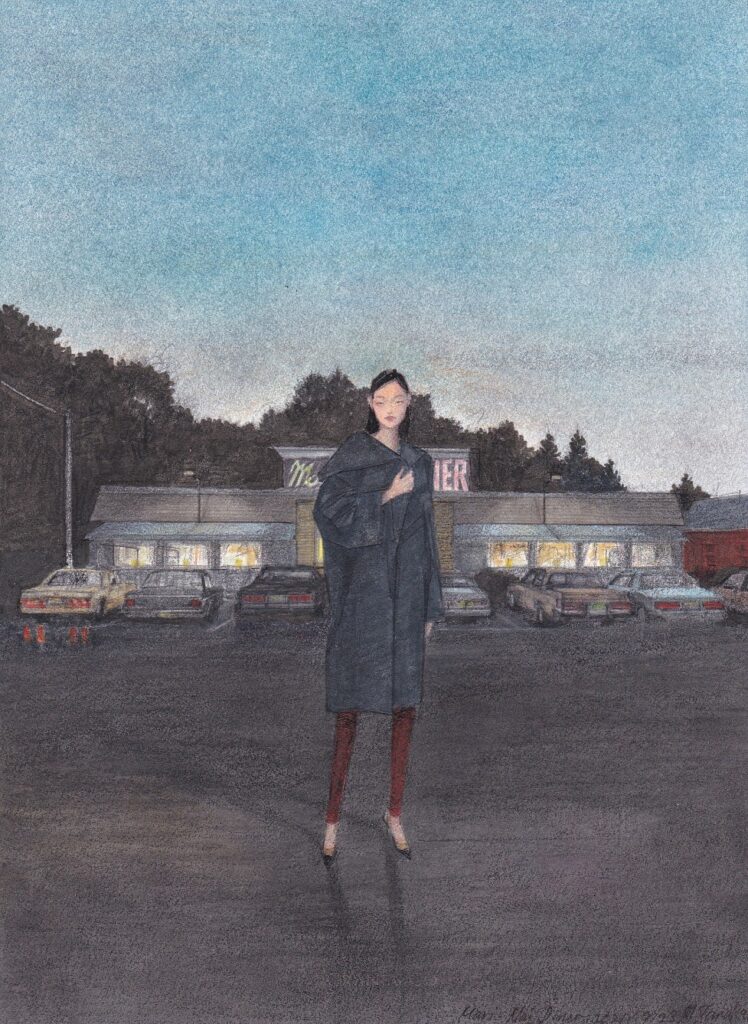 174×134mm CRANE&CO.レターペーパー(コットン100%) 色鉛筆、パステル、コピックマーカー 2022年 個人蔵 多摩の街には、幹線道路の上を横切る、誰からも忘れ去られたような寂しい歩道橋がたくさんあります。 その歩道橋の薄闇に一人の女性を立たせて... -