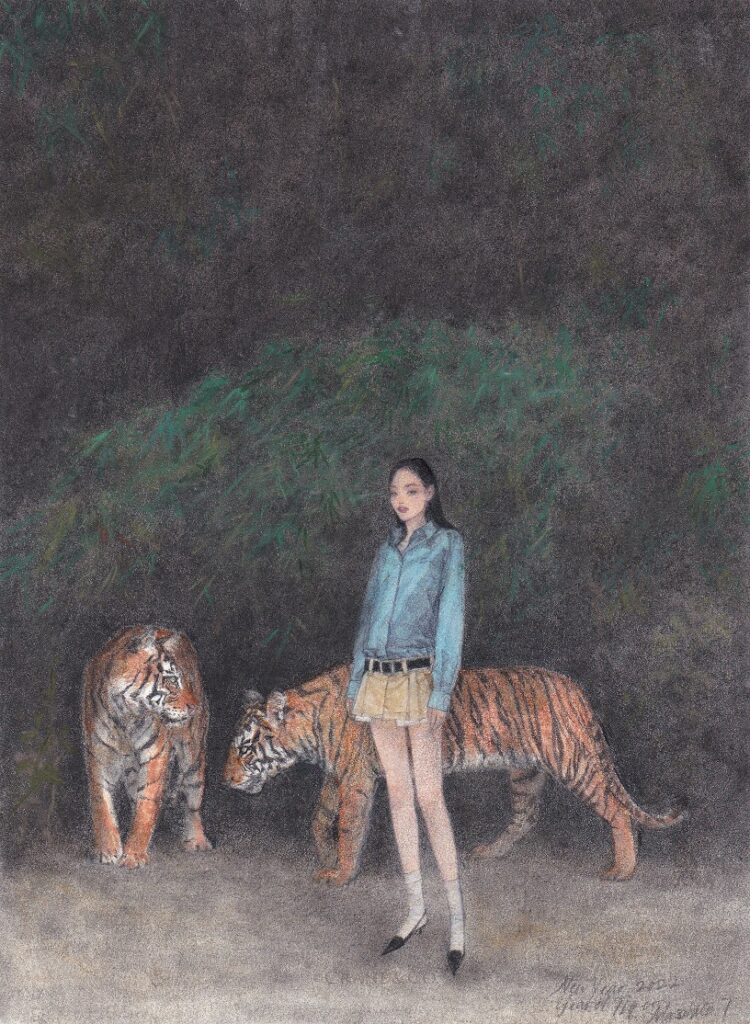 180×120 mm ARCHE水彩紙 色鉛筆、パステル、コピックマーカー 2023年 販売価格 ¥ 25,000(額装込み) 毎年の恒例になっている年賀状のための一枚。 女性の服装は Maison Valentino のPink PP Collection より。 -