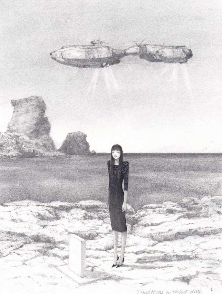 185×135mm CRANE&COレターペーパー(コットン100%) 色鉛筆、パステル、コピックマーカー 2021年 販売価格 ¥ 28,000(額装込み) 松任谷由実さんの音楽の中で最も好きな曲のうちの一つ、ヴォイジャー 〜日付のない墓標〜 をテーマにした一枚。 空に浮... -